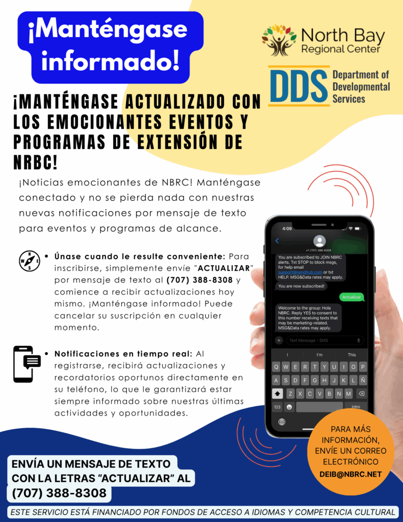 We obtain consent by verbally asking if you agree to receive conversational text messages from North Bay Regional Center. Message frequency varies. Message and data rates may apply. For assistance, text HELP, email support@nbrc.net, or call us at 888-256-2555 Ext. 6911. To opt out at any time text STOP. For more information visit the following: