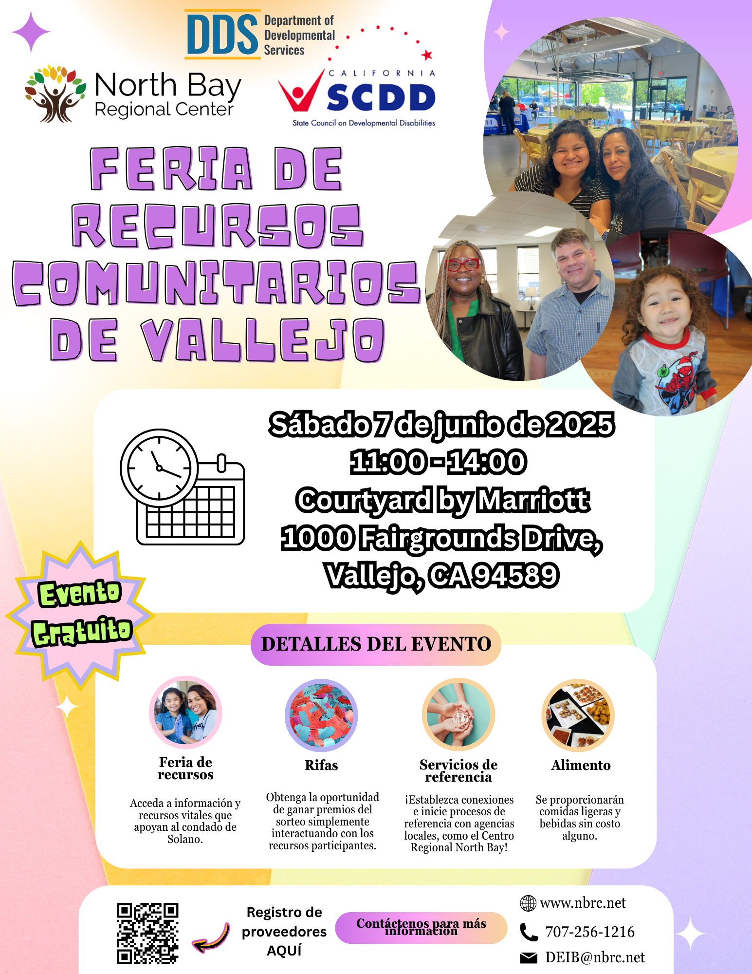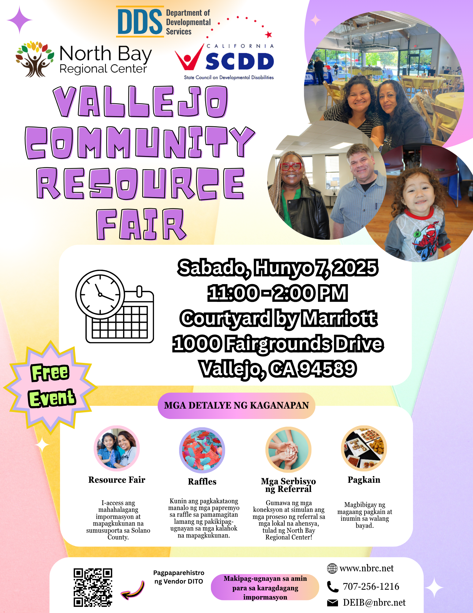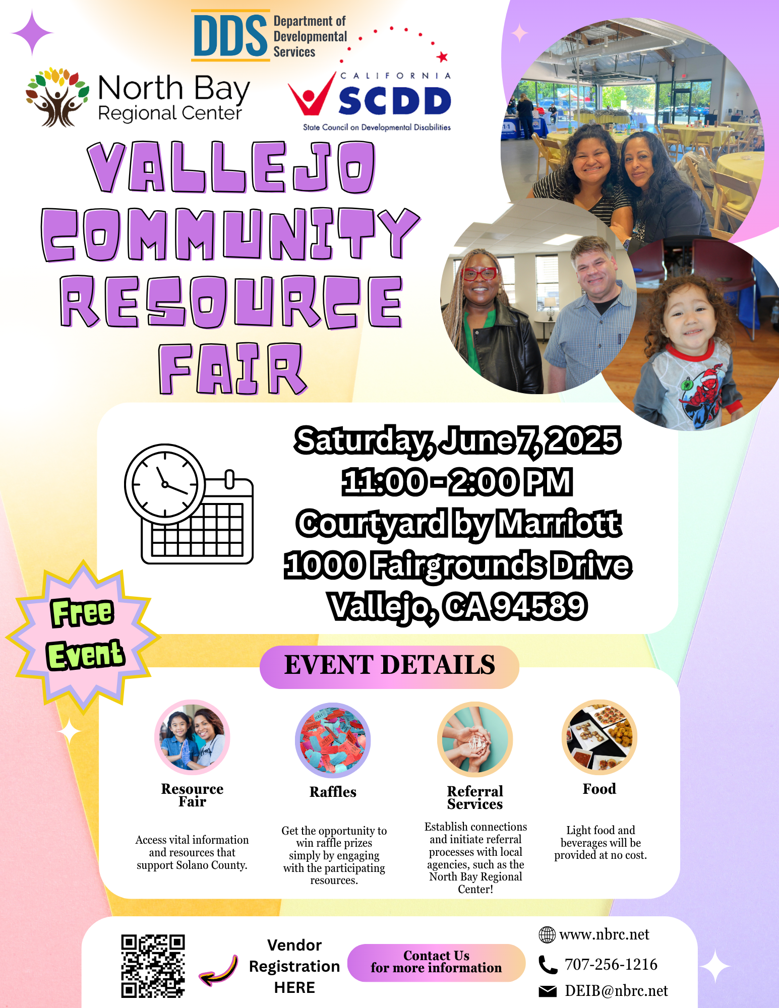 Our next resource fair will be held in Vallejo at Courtyard by Marriott on Saturday June 7th. Join us to discover helpful information and resources that support Solano County and the amazing service providers who care for our community! Registration is not required for clients and families. Service Providers who wish to participate may register by scanning the QR code on the flyer.